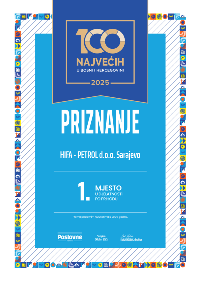Na svečanoj manifestaciji “100 najvećih u BiH”, koju tradicionalno organizuju Poslovne novine, kompanija Hifa Petrol još jednom je potvrdila svoj liderski status, osvojivši 1. mjesto po ostvarenim prihodima u svojoj djelatnosti u Bosni i Hercegovini.