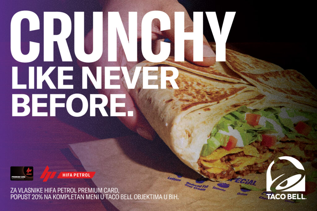 Uz Premium Card uživaj u 20% popusta na kompletan Taco Bell meni, u svim njihovim objektima u BiH – tokom cijele godine.